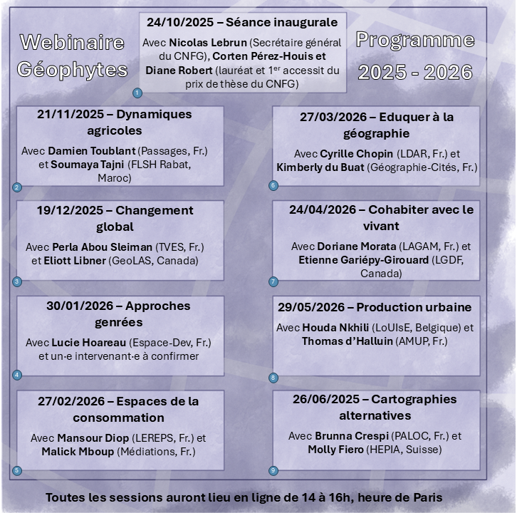 Les webinaires que nous proposons ont pour objectif de se réunir autour de différentes thématiques propres à la géographie ou au doctorat. Ces rencontres privilégient des espaces de présentations et d'échanges entre les membres du réseau.