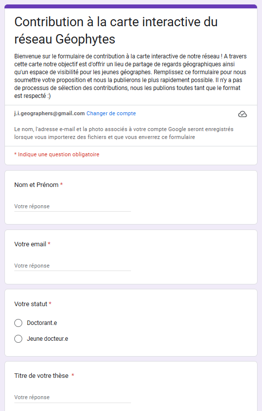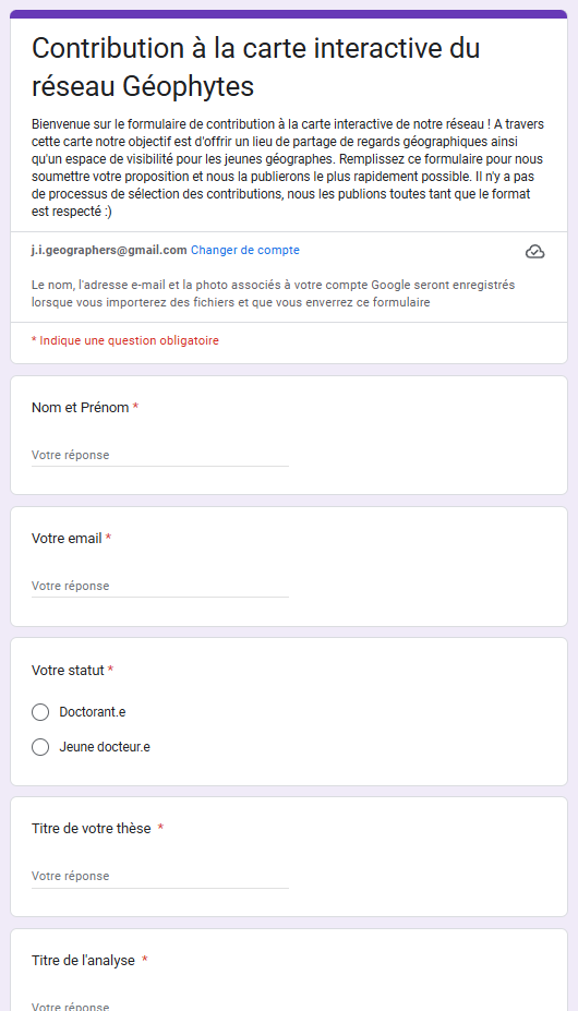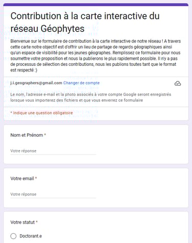 Pour contribuer à la carte interactive vous devez écrire une analyse d'une longueur comprise entre 200 et 500 mots environ, avec un titre. Joignez une illustration libre (photographie, carte, dessin...) ainsi qu'une biographie avec vos moyens de contacts soit en remplissant le formulaire ci-dessous soit en nous envoyant un mail à reseau.geophytes@gmail.com. Vous pouvez proposer plusieurs analyses, nous ne souhaitons pas limiter le nombre de contributions par auteur.e.